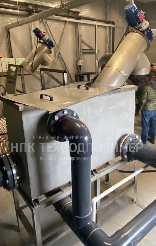 Фильтрующая зона представляет собой трубу, выполненную из перфорированного листа (решетка, сито). Зона транспортирования представляет собой цилиндр определенного диаметра. В верхней части изделия располагается патрубок сброса грубодисперсных примесей. Шнек устанавливается внутри корпуса изделия. Верхней опорой вала является привод, вал приводится в движение мотор-редуктором, который устанавливается на торце изделия через фланцевое соединение. В зоне фильтрации на шнеке закрепляются щетки, которые собирают осадок с сита и поднимают его в транспортную зону. Транспортирующий шнек подает осадок к месту сброса. Осадок сбрасывается в контейнер для дальнейшей утилизации